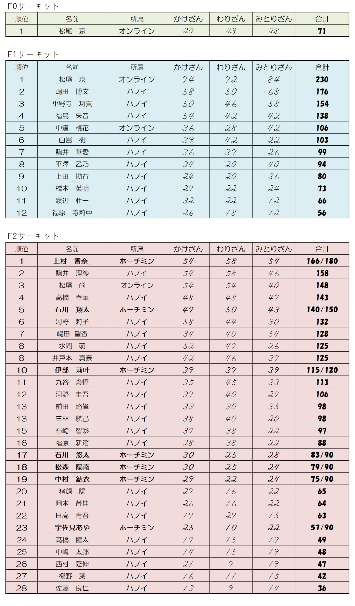 ※各選手の満点は、そろばん・暗算の習得段階によって異なります(たけのこ教室の選手は【結果/満点】で表示しています)。