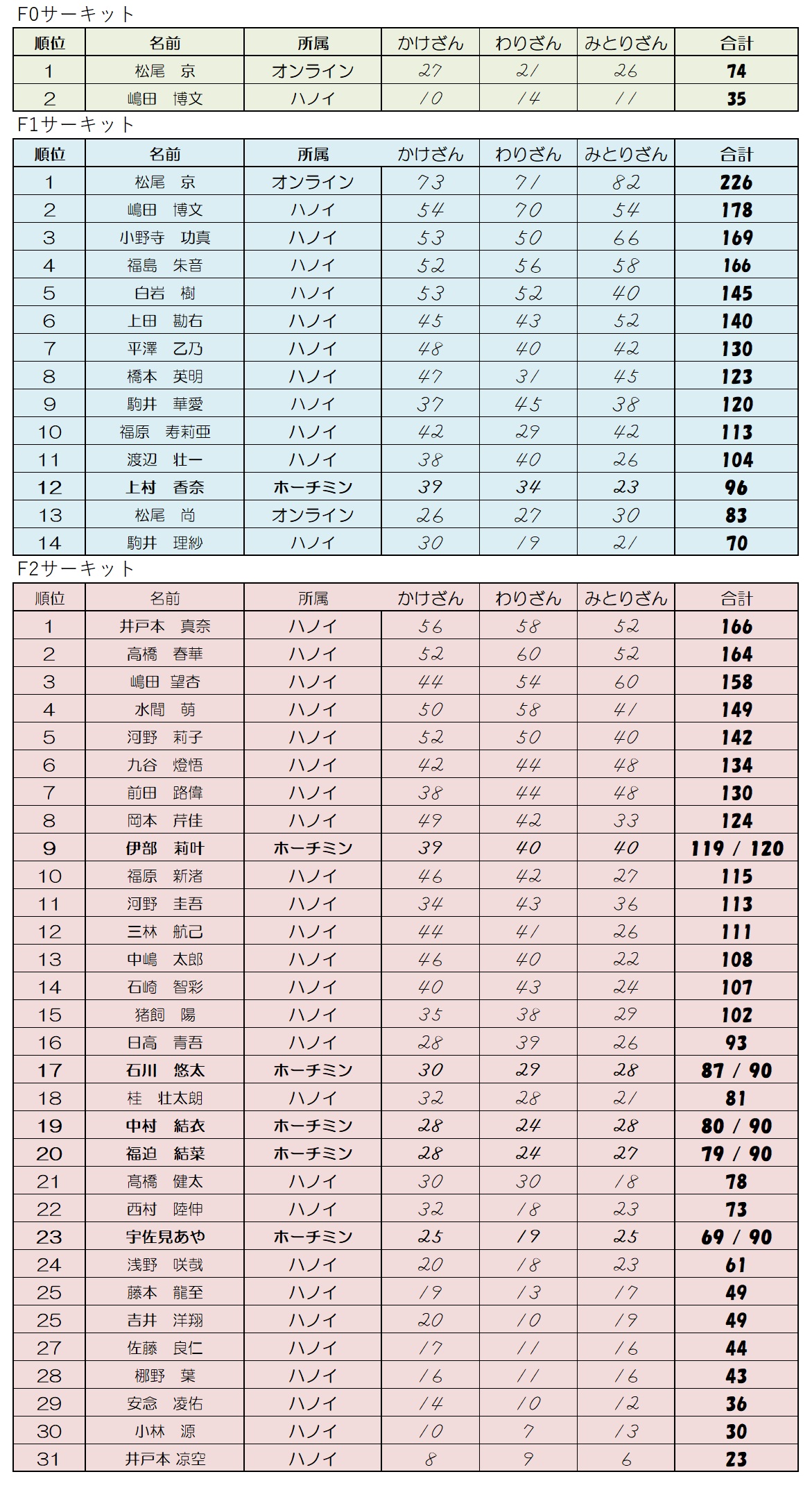 ※各選手の満点は、そろばん・暗算の習得段階によって異なります(たけのこ教室のF2レベルの選手は【結果/満点】で表示しています)。
